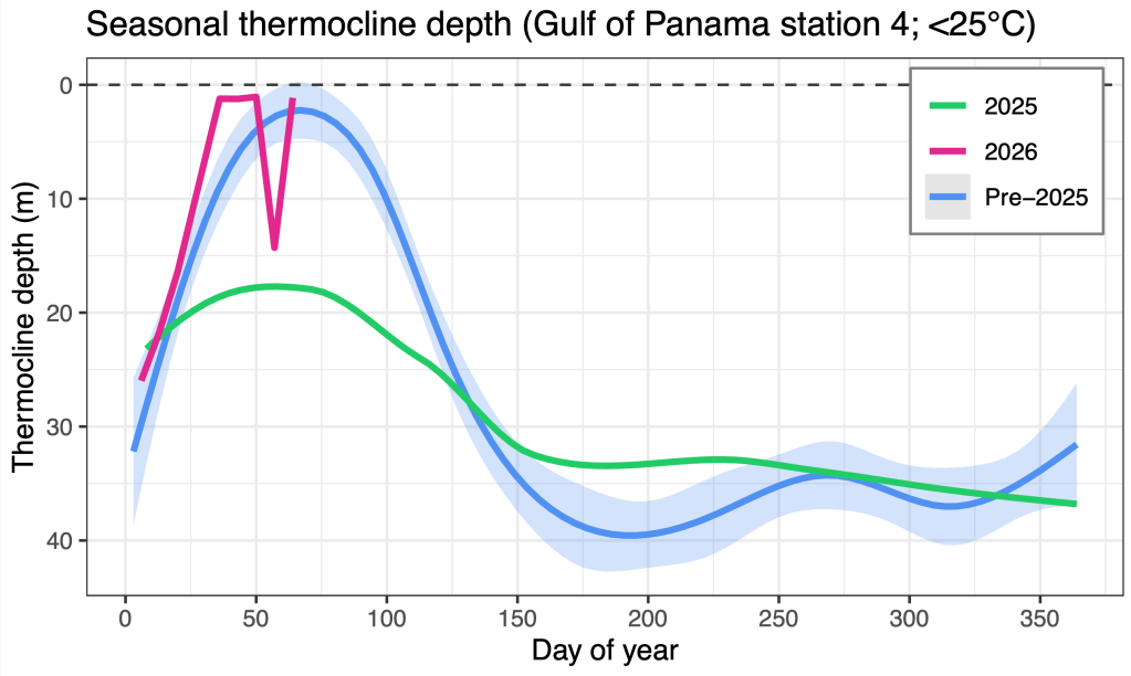 Update 18 feb, 2026: On the 12 feb, the thermocline was observed to at 1.24m water depth in the Gulf of Panama. This is almost identical to the week previous (1.22m).